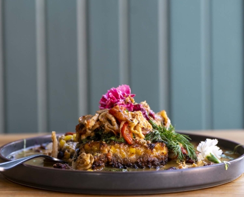 Smoked trout is an Appalachian classic, but here it’s refined into an elegant canapé with regional grains and preserved late-season tomato.