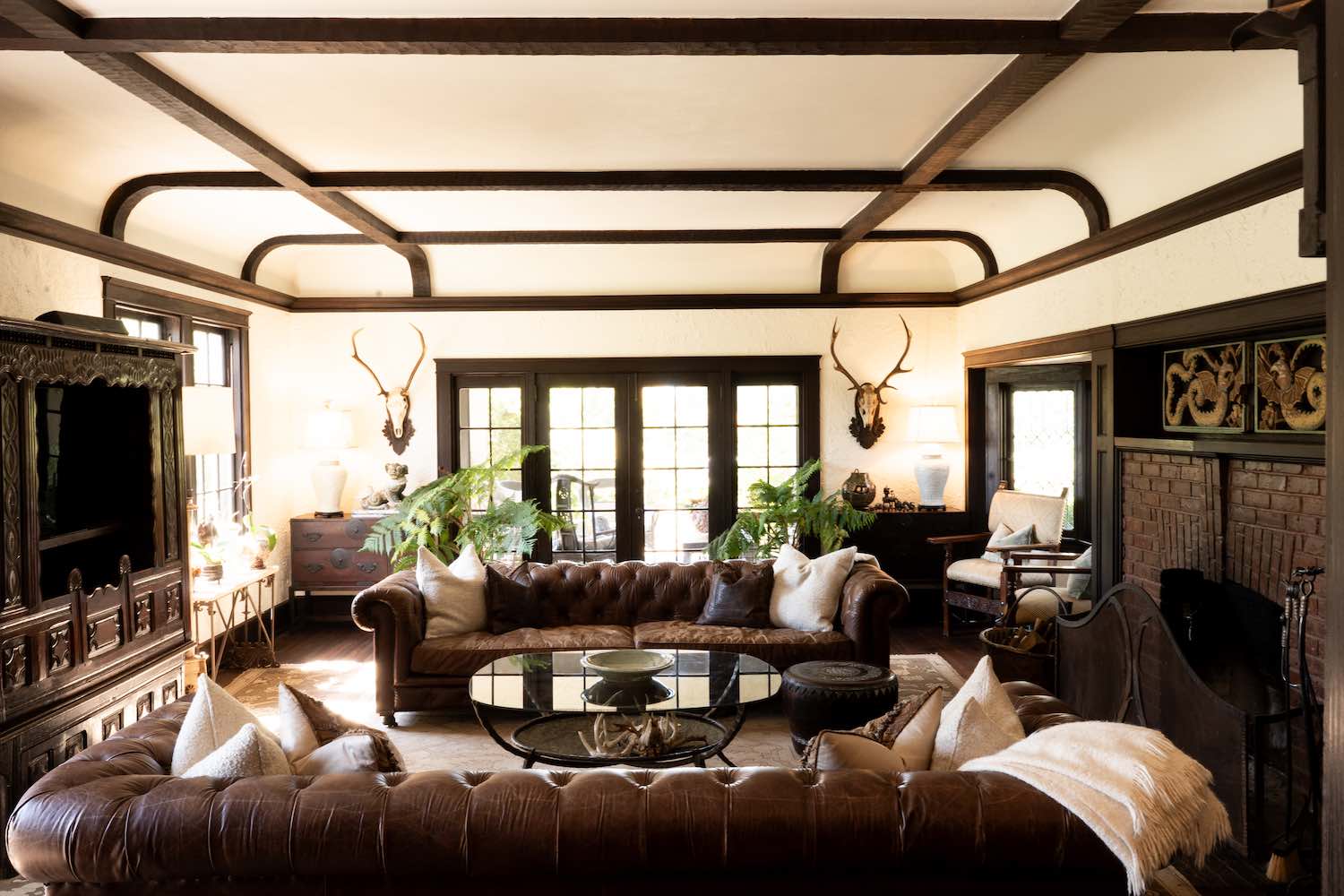 A pair of deep leather couches beckon guests, and there’s a charming seating area near a set of corner windows. The TV is set in a repurposed bed box from France, and its twin—another bed box—acts as a storage chest in the entrance hall.