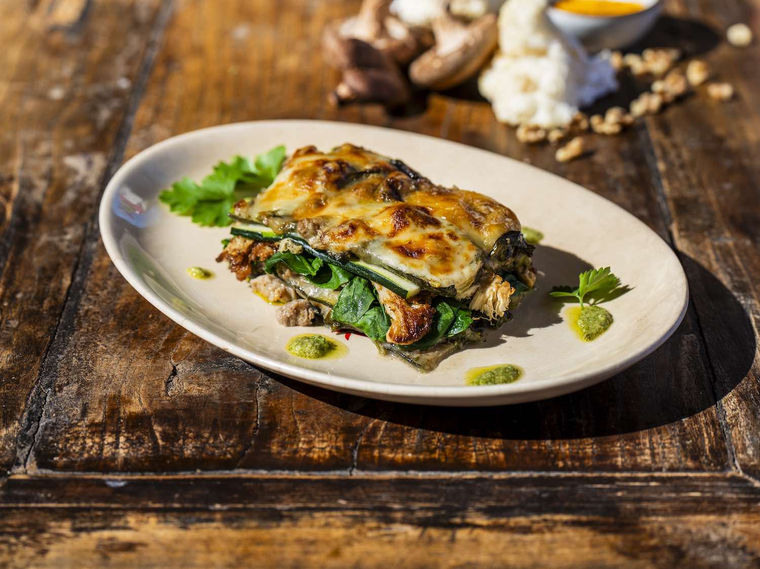 Zucchini Lasagna with ramp pesto, goat cheese, Lion’s Mane mushrooms, spinach & parsley